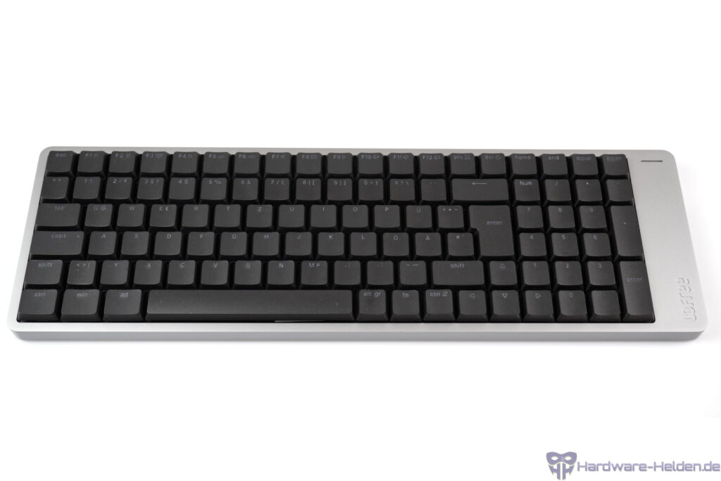 Bei der Flow2 100 handelt es sich um eine Tastatur im 96%-Format mit dem typischen gedrungen Layout, das in der ersten Zeit sicher ein paar Bedienfehler mit sich bringt, wenn man es nicht kennt. Bedingt durch das an der rechten Seite verbreiterte Gehäuse kommt die Tastatur dennoch auf eine Breite von immerhin ~40 cm und erfüllt die platzsparenden Eigenschaften des Layouts damit nicht bis aufs letzte, was etwas im Gegensatz zum gedrungen Tastenfeld steht.