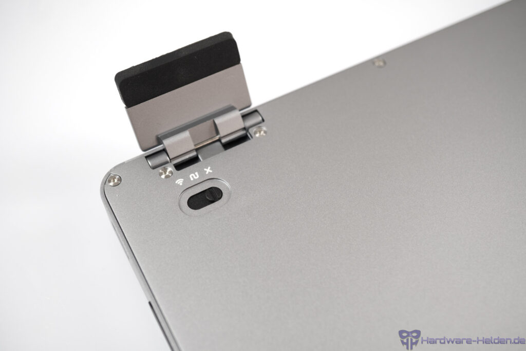 Gleiches gilt im Prinzip auch für den Schalter der Tastatur, mit dem man zwischen Aus/Kabel/Kabellos wählt. Nicht nur, dass dieser auf der Unterseite der Tastatur ist, man hat ihn auch noch unter einem der aufstellbaren Füße platziert. Das mag elegant versteckt sein, aber eben nicht perfekt erreichbar, wenn man diesen öfters nutzt. Die Füße lassen sich lediglich in einer Stufe aufstellen, dass haben wir bei der Flow2 aber als ausreichend empfunden.
