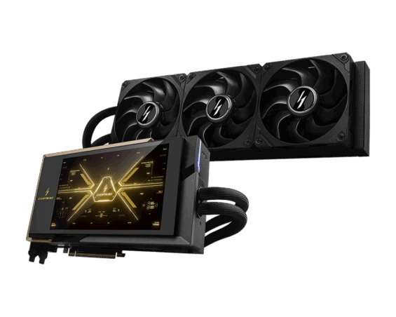 Zur Kühlung der Grafikkarte nutzt MSI eine AiO-Wasserkühlung bestehend aus Pumpe, 360-mm-Radiator und einem Kühler auf dem ein 8 Zoll-Display verbaut ist. Auf diesem können Systemwerte, Artworks und Animationen angezeigt werden. Zudem ist auf dem Kühler die Nummer der Karte aufgebracht, was die Seltenheit unterstreichen soll. Die MSI GeForce RTX 5090 32G LIGHTNING Z ist auf 1300 Exemplare limitiert.