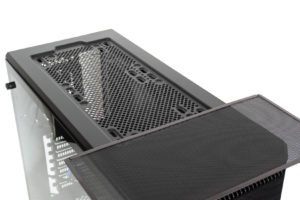 Ansonsten ist verfügt der Deckel über ein großes Lüftergitter samt magnetischem Staubfilter. Dort können sowohl zwei 120mm als auch 140mm Lüfter installiert werden. Radiatoren fallen aufgrund des geringen Abstandes zum Mainboard jedoch raus.