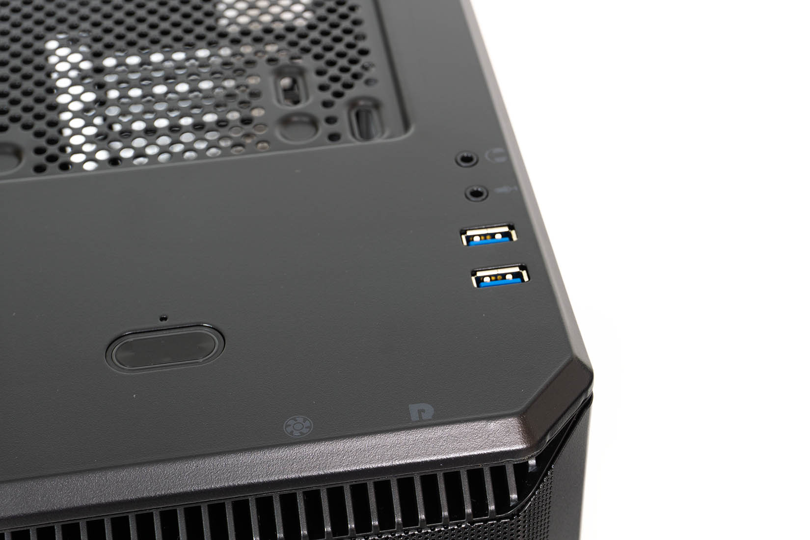 Der gepulverte Stahldeckel steht vorn leicht über. Unter dem Überstand sind der Resetbutton sowie die Lüftersteuerung versteckt. Letztere verfügt über drei Stufen, die jedoch nicht visuell dargestellt werden. Mittig auf dem Deckel ist der beleuchtete, große Powerbutton eingelassen. An der rechten Kante sind zwei USB 3.0 Port platziert und die Audioanschlüsse wurden schön in den Deckel integriert.