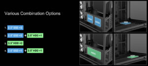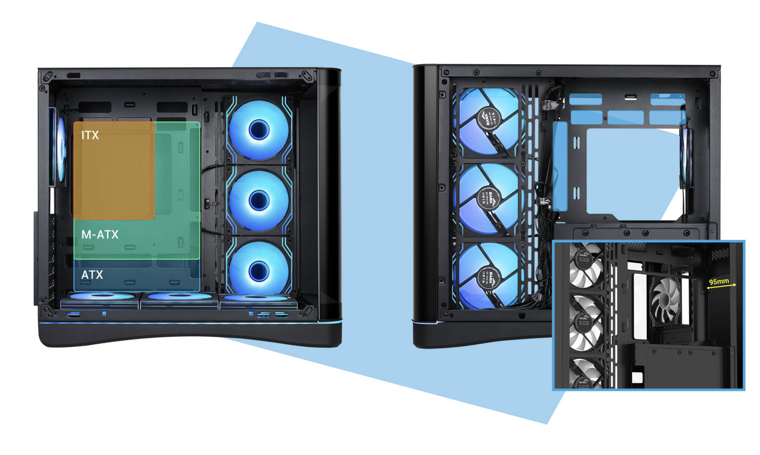 Das Gehäuse im typischen Zweikammer-Design kann maximal ATX-Mainboards, 160 mm hohe CPU-Kühler und 445 mm lange Grafikkarten aufnehmen. Auch Mainboards mit rückseitigen Anschlüssen sind kompatibel. Auf der Rückseite gibt es bis zu 95 mm Platz für das Kabelmanagement. Außerdem können bis zu drei SSDs oder zwei HDDs in unterschiedlichen Kombinationen verbaut werden.
