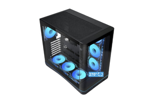SAMA hat mit dem V62 ein Zweikammer-Gehäuse mit gebogener Scheibe und sieben ARGB-Lüftern ab Werk für rund 100 € vorgestellt.