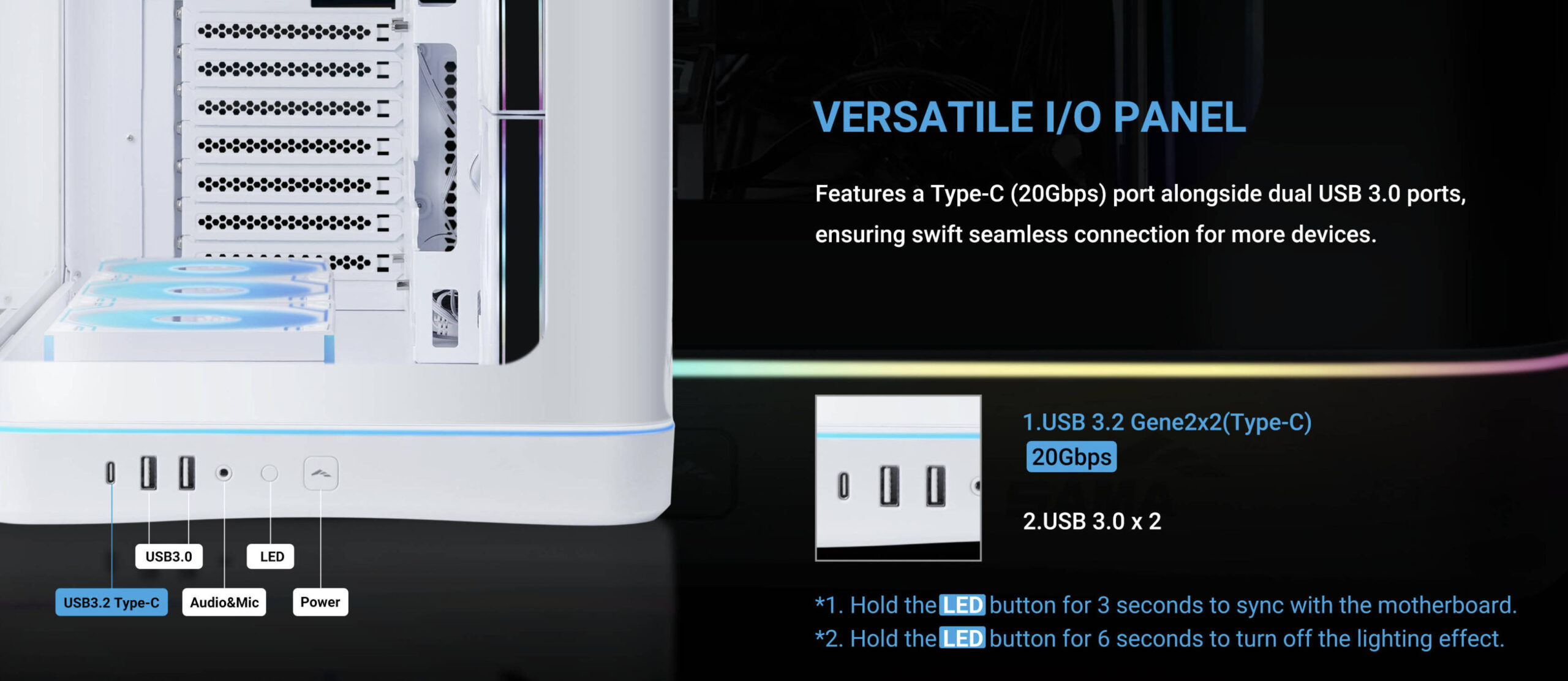 Das I/O-Panel vorne am Gehäuse bietet einen USB 3.2 Typ-C und zwei USB 3.0-Anschlüsse. Am unteren Rand der Panoramascheibe verläuft zu dem ein ARGB-Streifen.