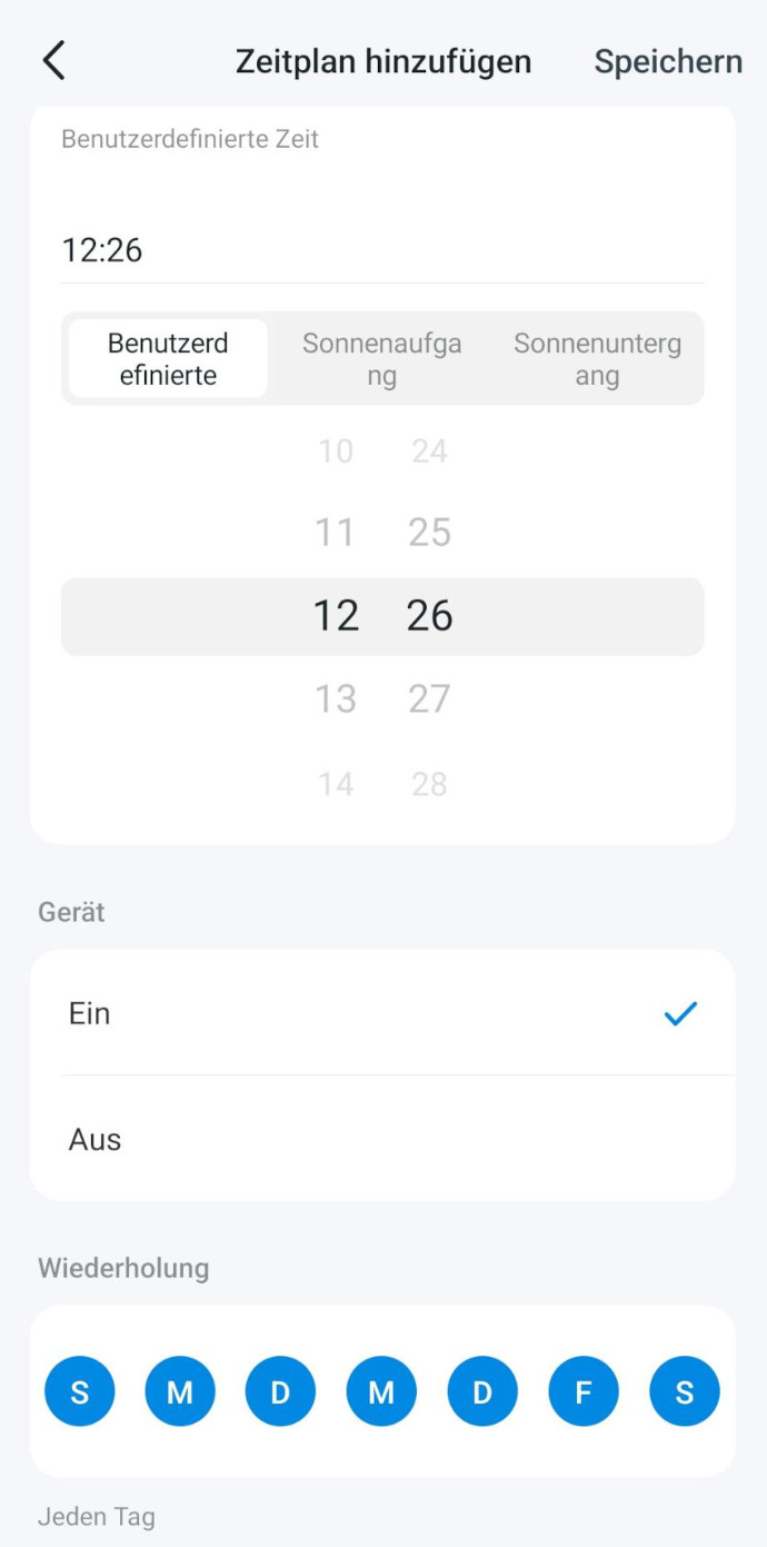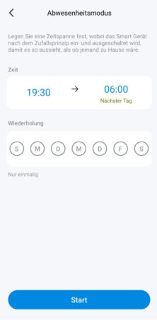 In der App lassen sich eine simple Zeitschaltuhr (Beispielsweise „Aus“ in 2 Stunden) programmieren, oder natürlich auch komplexere Zeitpläne erstellen. Bei letzteren wählt man eine Uhrzeit und bestimmt die Tage. Beispielweise „An“ täglich um 22 Uhr oder „„Aus“ um 10 Uhr Montags und Dienstag“