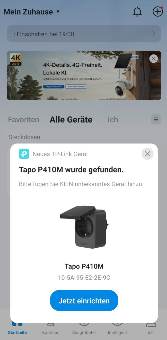 Für die Tapo-App ist ein Benutzerkonto erforderlich. Danach kann die Steckdose hinzugefügt werden. In unserem Fall hatten wir bereits die Tapo App, die von sich aus meldete, dass ein neues Geräte verfügbar ist – einfacher geht es kaum.