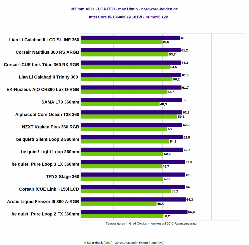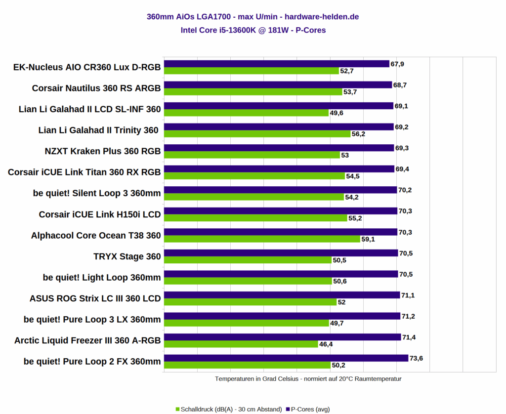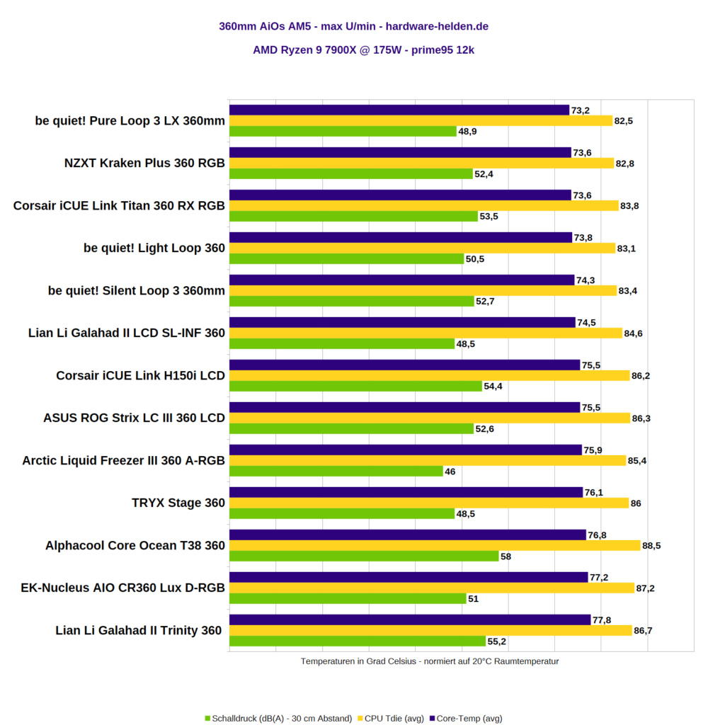 Auf unserem System erreichte die TRYX Stage bei maximaler Drehzahl eine etwas unterdurchschnittliche Leistung, wobei sie sich im Groben noch vollkommen im erwartbaren Bereich platziert und eine angemessene Kühlleistung für ein 360-mm-Modell erreicht. Bei max. ~1850 U/min wird sie zwar durchaus laut, aber es gibt lautere Modelle, sodass auch wegen der vergleichsweise moderaten maximalen Drehzahl etwas an maximaler Leistung liegen bleiben dürfte. Sie kommt bei uns grob auf ähnliche Werte wie die Pure Loop 3 von be quiet! Nur die P-Cores betrachtet, schneidet die Stage etwas besser ab.