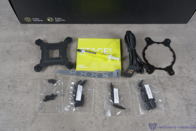 Die Stage kommt mit vormontierten Lüftern, während das Display als separates Modul enthalten ist. Im Lieferumfang befindet sich ansonsten das Montagematerial samt Anschlusskabel für die Lüfter. Schön ist, dass neben der auf dem Kühlerboden applizierten Wärmeleitpaste noch eine Spritze mit weiterer Wärmeleitpaste enthalten ist.
