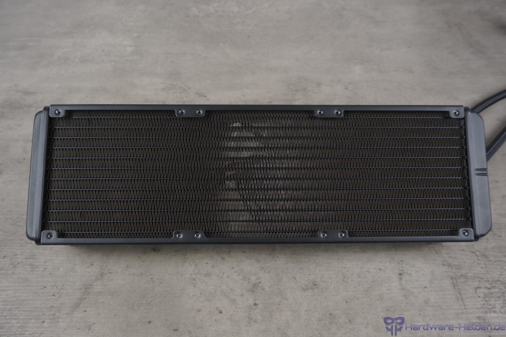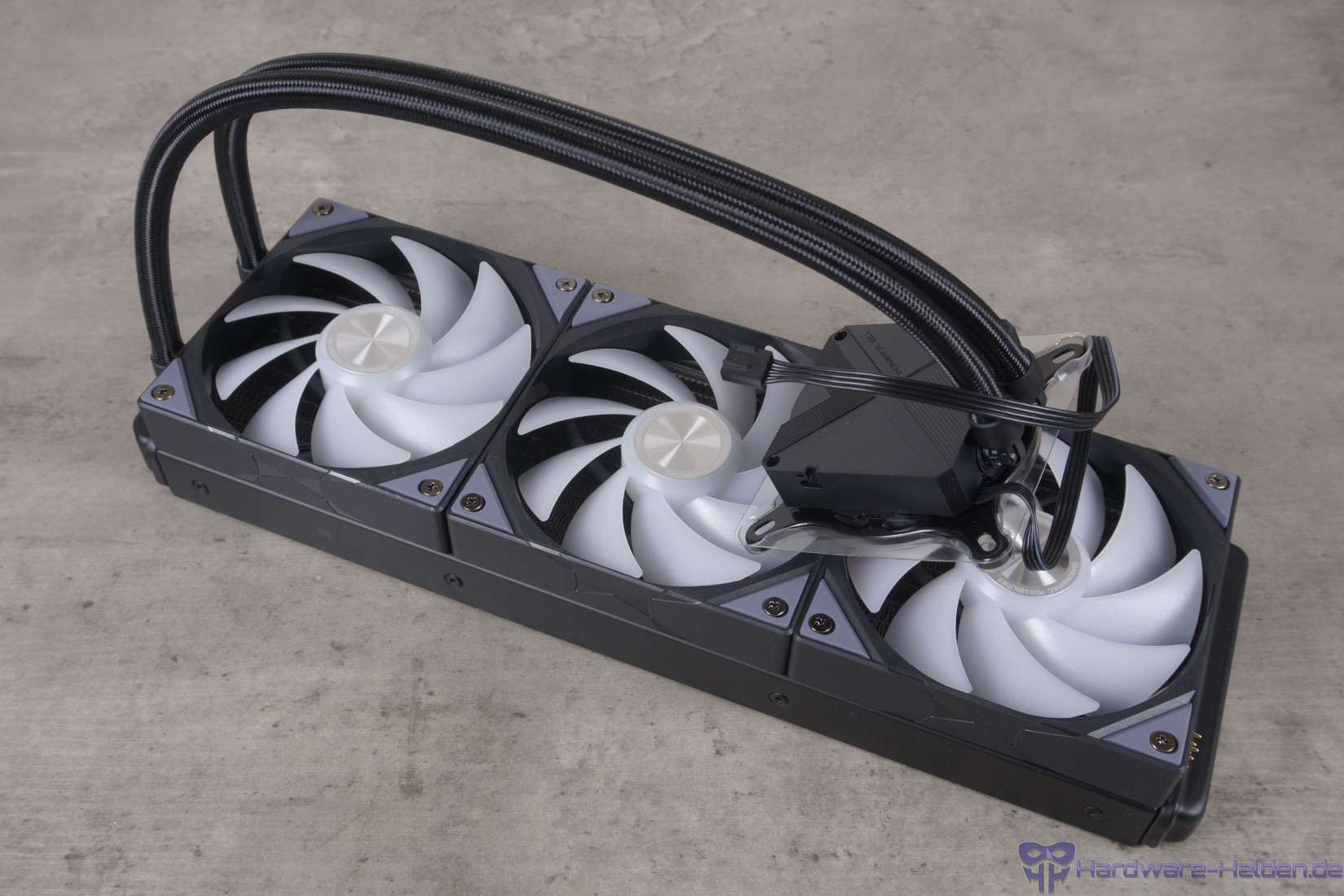 Die Basis der AiO-Wasserkühlung ist hingegen üblicher Standard, der sich dank PWM-Anschlüsse aber einfach über das Mainboard steuern lässt. Bei der Pumpe dürfte dies auch notwendig sein, da sie im oberen PWM-Bereich durchaus stören kann. Der große Drehzahlbereich ermöglicht auch einen sehr leisen Betrieb, kann aber auch viel Leistung kosten. Diese befindet sich im üblichen, wenn auch nicht hohem Bereich einer 360-mm-AiO. Hier lässt die Stage wohl auch wegen der moderaten maximalen Drehzahl sicher etwas liegen.