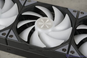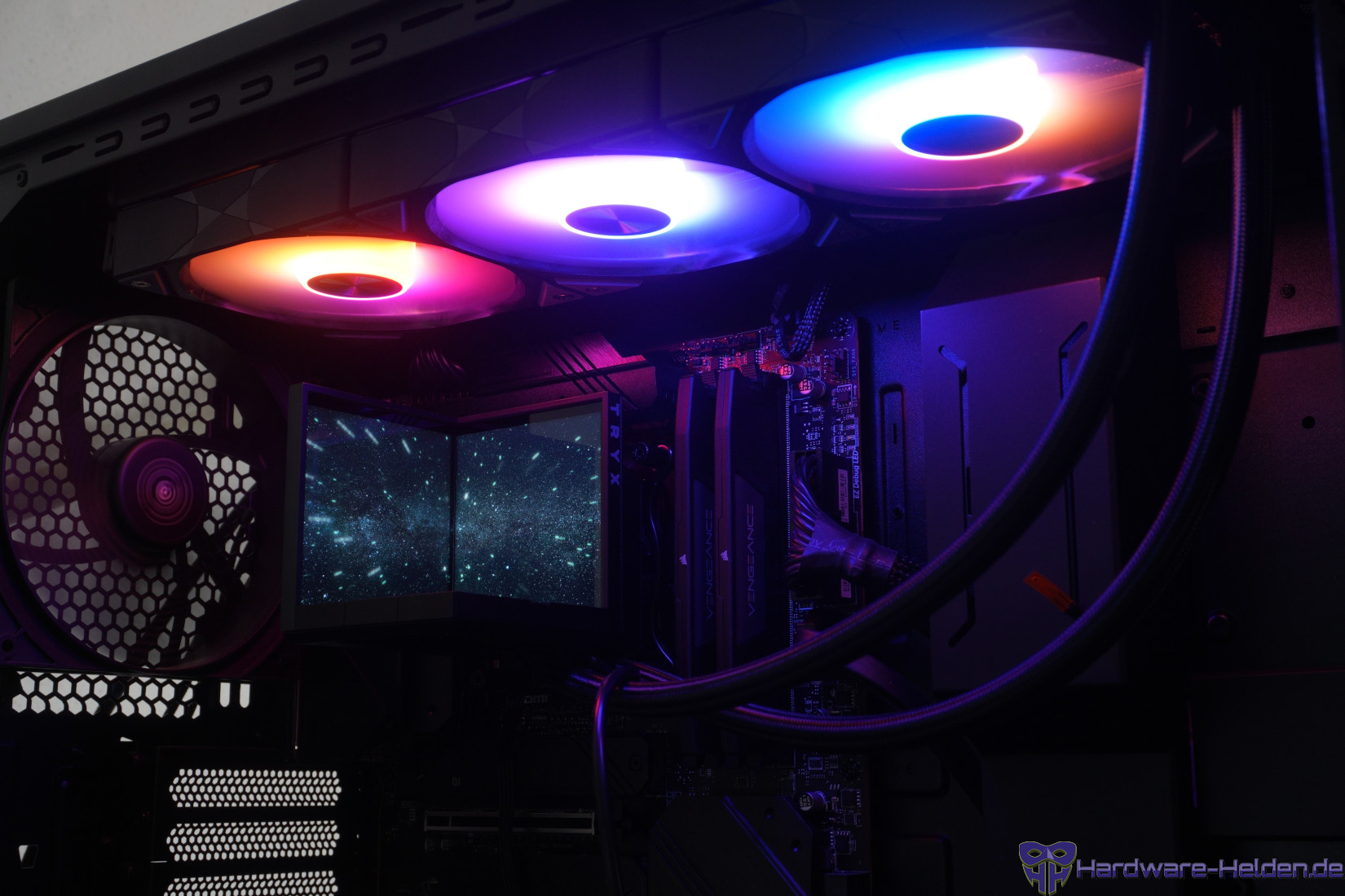 Während der große 360-mm-Radiator nicht weiter erwähnenswert ist und gut verarbeitet wirkt, sind die ROTA SL-Lüfter einen Blick wert. Sie haben untereinander ein kabelloses Verbindungssystem, sowie eine ARGB-Beleuchtung über die Nabe.