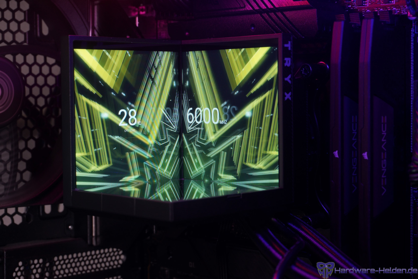 Die TRYX Stage 360 ist ohne Zweifel eine optisch beeindruckende AiO. Das Prinzip des Displays auf einer AiO treibt TRYX auf die Spitze und spendiert der Kühlung gleich zwei sehr große Bildschirme, die gemeinsam und getrennt betrieben werden können. Wenn man das Dual-Display für dekorative Zwecke nutzt, sieht das bei entsprechendem Material schon cool aus. Der Winkel und die optionale Spiegelfläche machen ziemlich was her und man kann es als kleine Bühne für Gegenstände nutzen. Wir hätten uns aber mehr Anpassungsmöglichkeiten gewünscht, um das Potenzial der Displays ausreizen zu können. Das sperrige Modul sieht im ausgeschalteten Zustand auch etwas befremdlich aus.