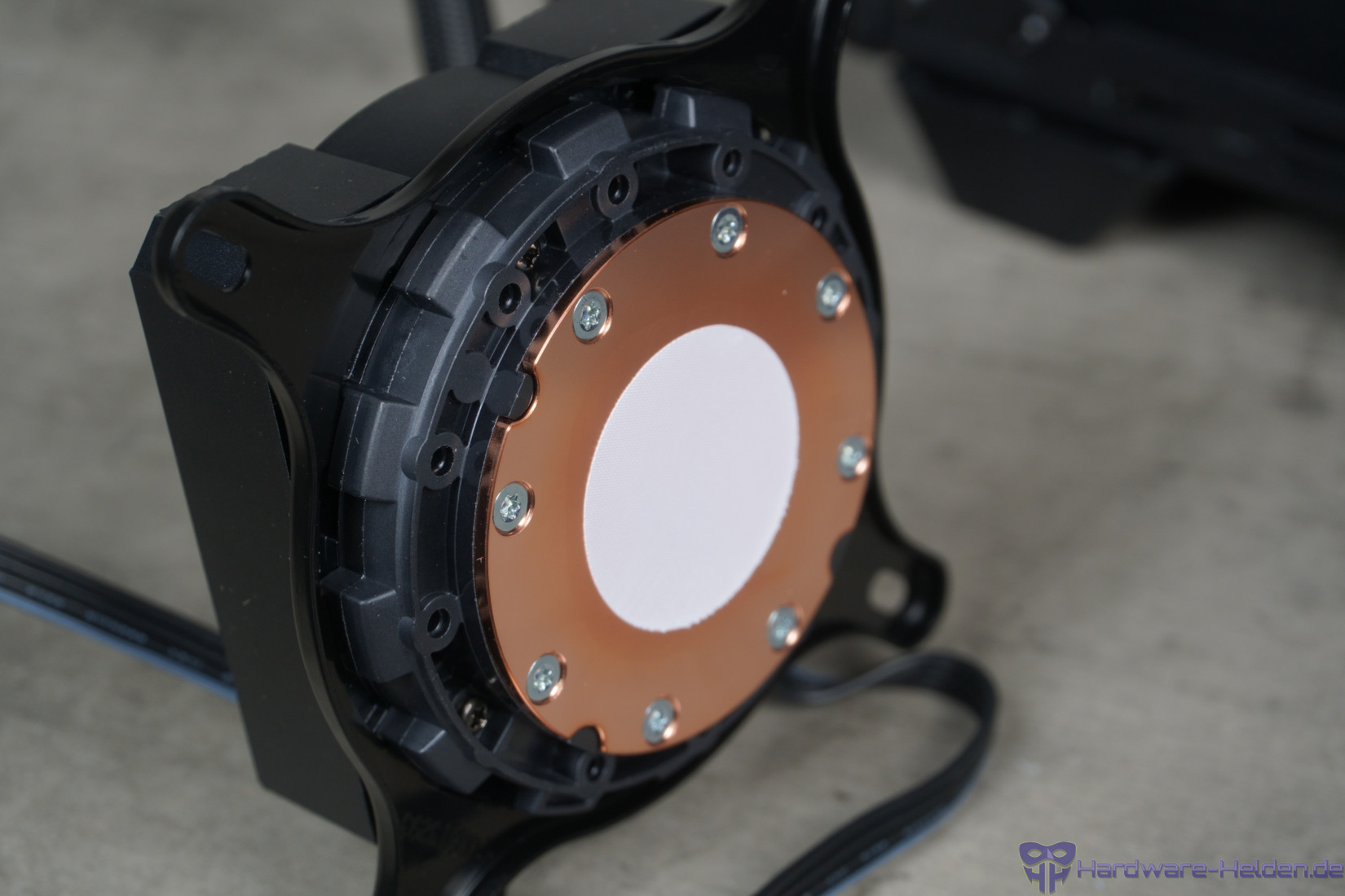 Von unten sieht man einen Kupferboden mit aufgetragener Wärmeleitpaste. Im Inneren arbeitet eine Pumpe von Asetek, die maximal 2800 rpm erreicht. Mittels PWM-Anschluss kann sie auf bis zu 800 rpm gedrosselt werden. Der Vorteil an dieser Lösung ist, dass man zum Steuern von Pumpe (und Lüfter) nicht auf eine Software des Herstellers angewiesen ist, sondern dies ganz einfach über das Mainboard durchgeführt wird. Die Pumpe ist in höheren Bereichen recht penetrant, kann aber durchaus leise betrieben werden, dazu unten ein paar Worte mehr.