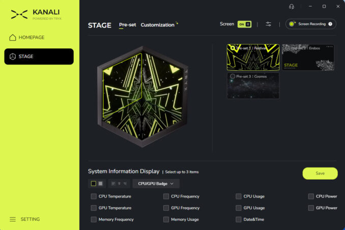 Im Hauptmenü kann zwischen drei Presets gewählt werden. Dabei handelt es sich um drei unterschiedliche Animationen. Auf jedem Bildschirm können drei der angebotenen Systemdaten dargestellt werden, was im Grunde den Platz aber nicht ausreizt.